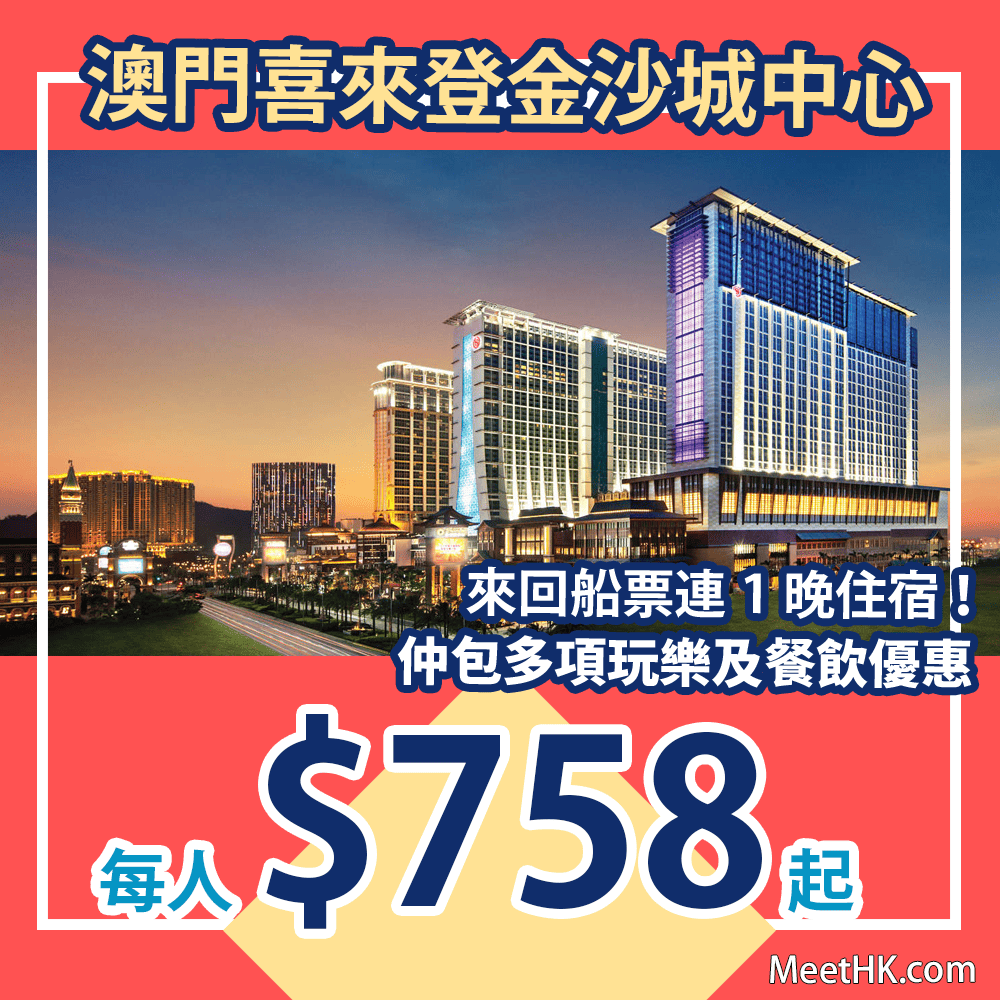 快閃澳門!享各式優惠!包自助早餐或午餐!澳門2日1夜喜來登金沙城中心酒店連噴射飛航來回船飛套票每人只需$758起!