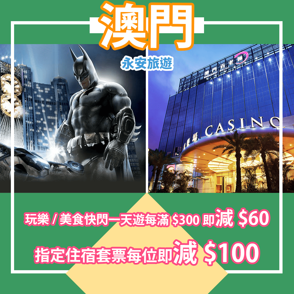 澳門大優惠!快閃一天遊或住宿套票都有減!玩樂/美食快閃一天遊每滿$300即減$60!指定住宿套票每位減$100!澳門來回船票+酒店住宿套票每人只需$523起 – 永安旅遊