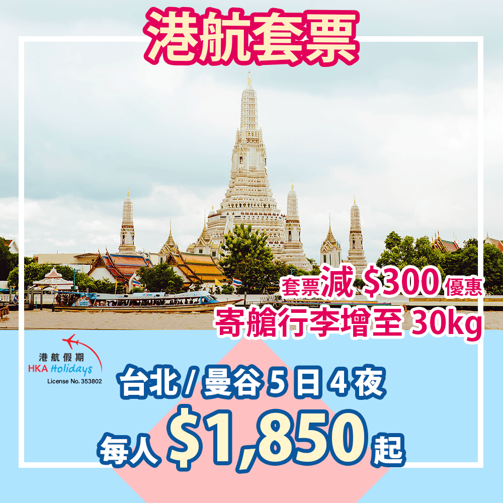 秋風起!又喺時候去旅行!全線旅遊套票減$300優惠!台北/曼谷5日4夜套票(機票+酒店)只需$1,850起 – 港航假期 (優惠至10月31日)