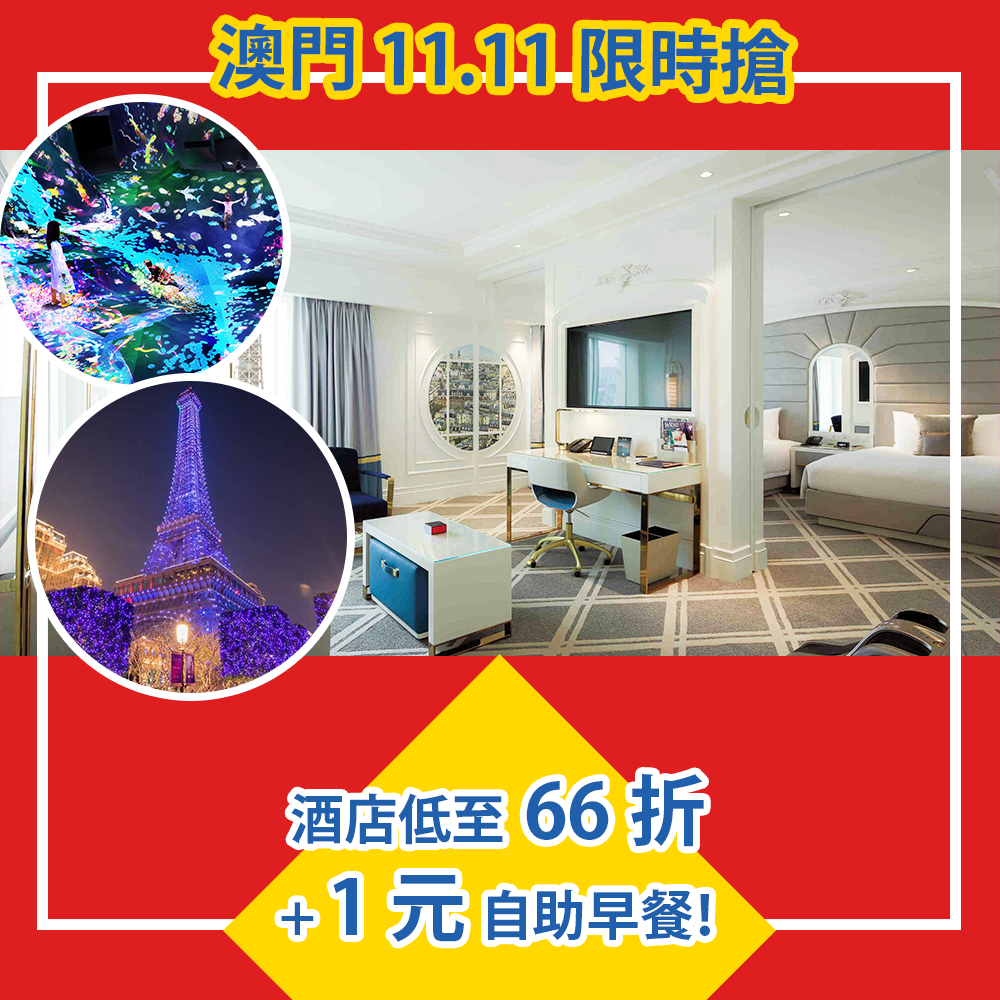 即搶!澳門11.11限時搶!低至66折!超抵呀!澳門巴黎人酒店每晚HK$798++起!仲有$1換購自助早餐!爆抵價HK$60換購頭等艙船飛!(優惠至11月11日11:59pm)