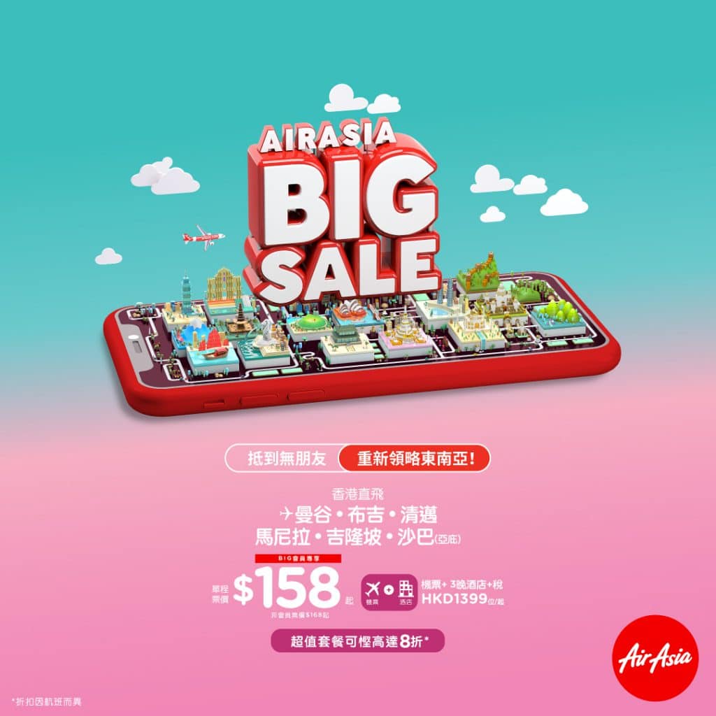 抵呀!AirAsia Big Sale!重新領略東南亞!賣到2021年!香港飛沙巴(亞庇)來回連稅$696起、吉隆坡$776起、曼谷$771起、清邁$791起、布吉$811起 – AirAsia