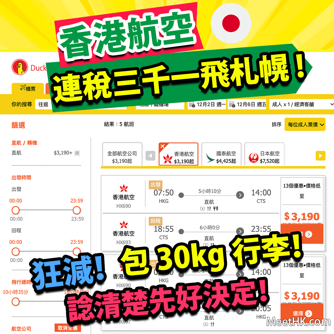 連稅三千一飛札幌!包30kg行李!Last Minutes出發!香港往返札幌只需$2,438起 – 香港航空