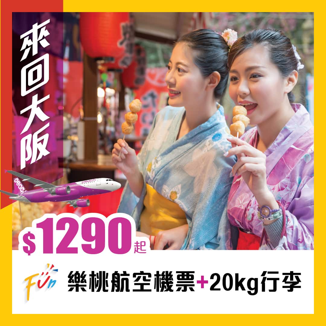 樂桃航空來回大阪$1,290起,連埋稅都只係$1,850起!