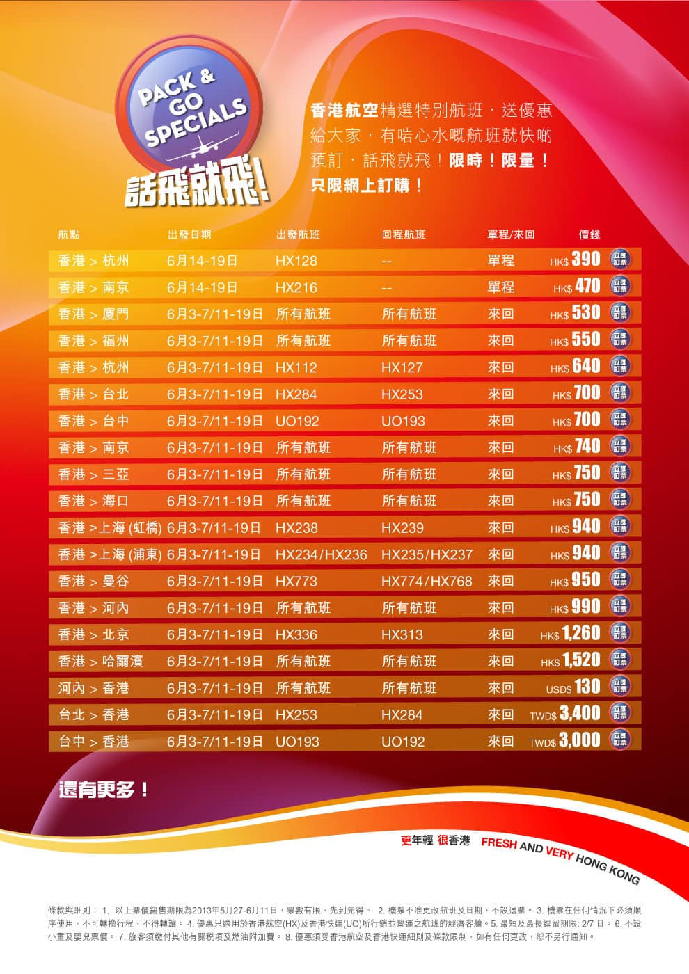 凌晨開賣!話飛就飛優惠!香港往返台北、台中只需$700,曼谷$950,北京$1,260 – 香港航空 (優惠至6月11日)