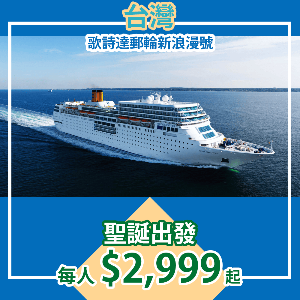抵!聖誕出發!平坐郵輪玩台灣!慳返機票+酒店錢!包食住!歌詩達郵輪.新浪漫號 5晚香港、台灣 (基隆、台中、高雄) 郵輪假期每人$2,999起 (優惠至11月30日)