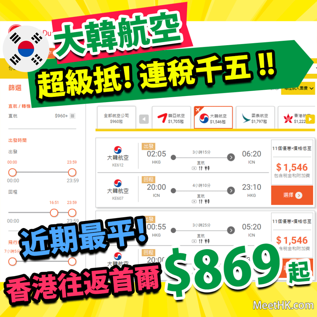 香港往返首爾只需$869起,連稅$1,546起,比之前優惠最平多二百蚊!