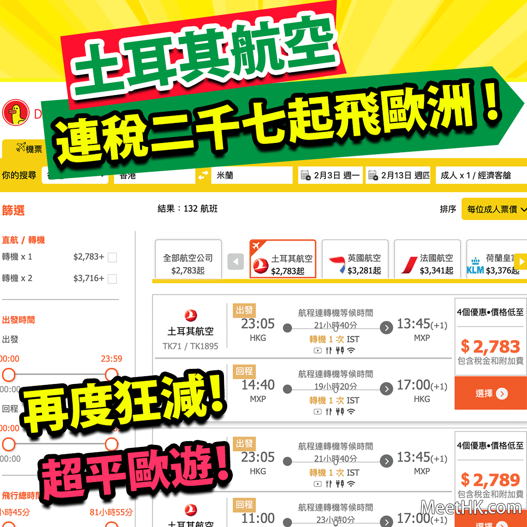 嘩!再度狂減!連稅2千7起飛歐洲!Open Jaw!可Stopover伊斯坦堡!香港往返歐洲各地只需$263起 – 土耳其航空 (優惠至12月31日)
