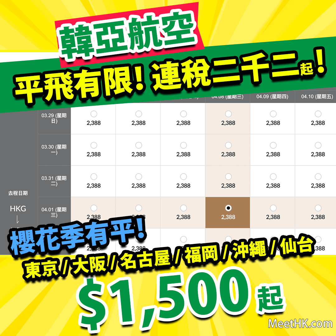 抵!韓亞飛日本!連稅二千二起!櫻花季都有平!香港飛東京/大阪/名古屋/福岡/沖繩/仙台只需$1,500起 – 韓亞航空 (優惠至12月31日)