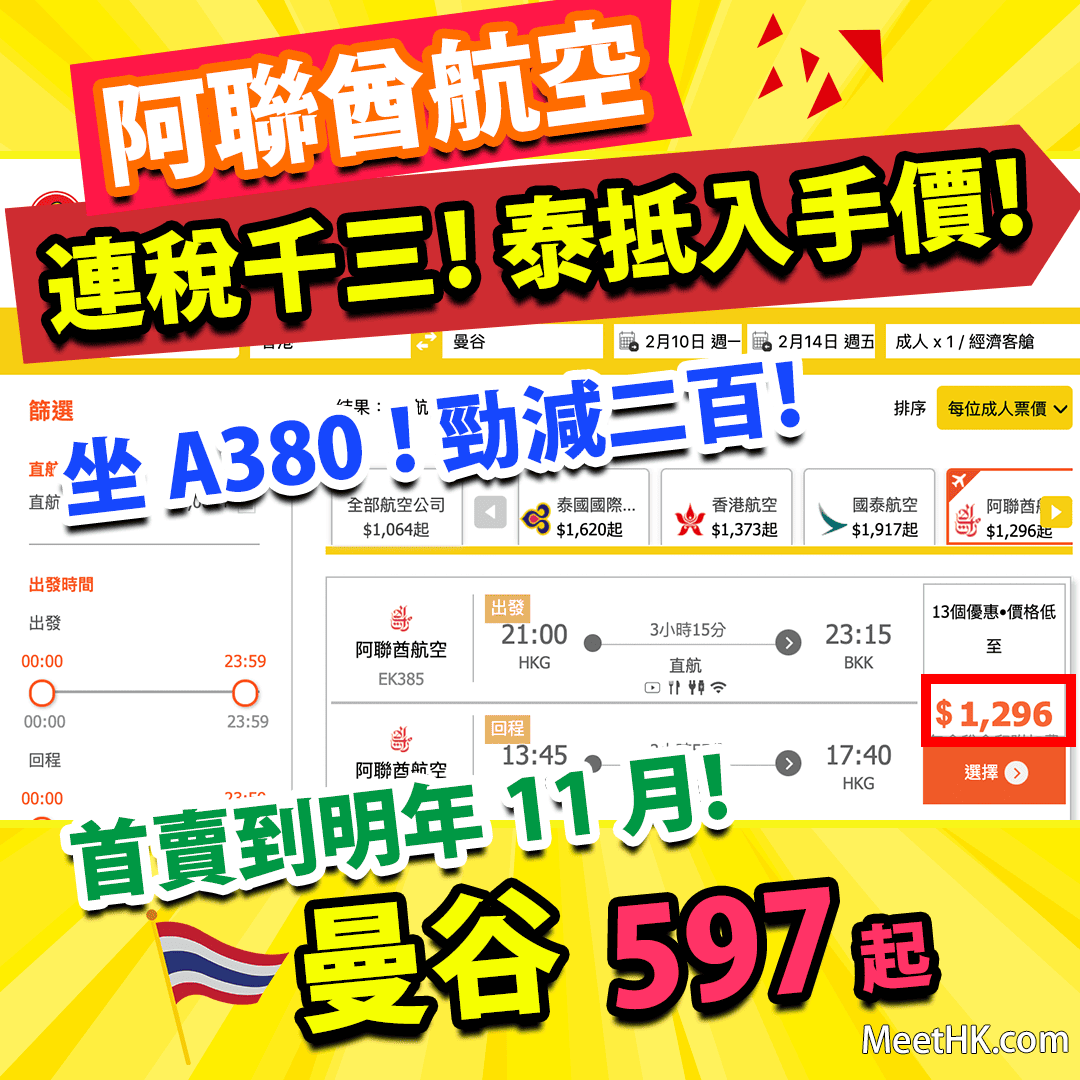 嘩!連稅唔駛千三!泰抵入手價!阿聯酋航空飛曼谷激減!坐A380!首賣到明年11月25日前出發!香港往返曼谷只需$597起 – 阿聯酋航空 (優惠至1月13日)