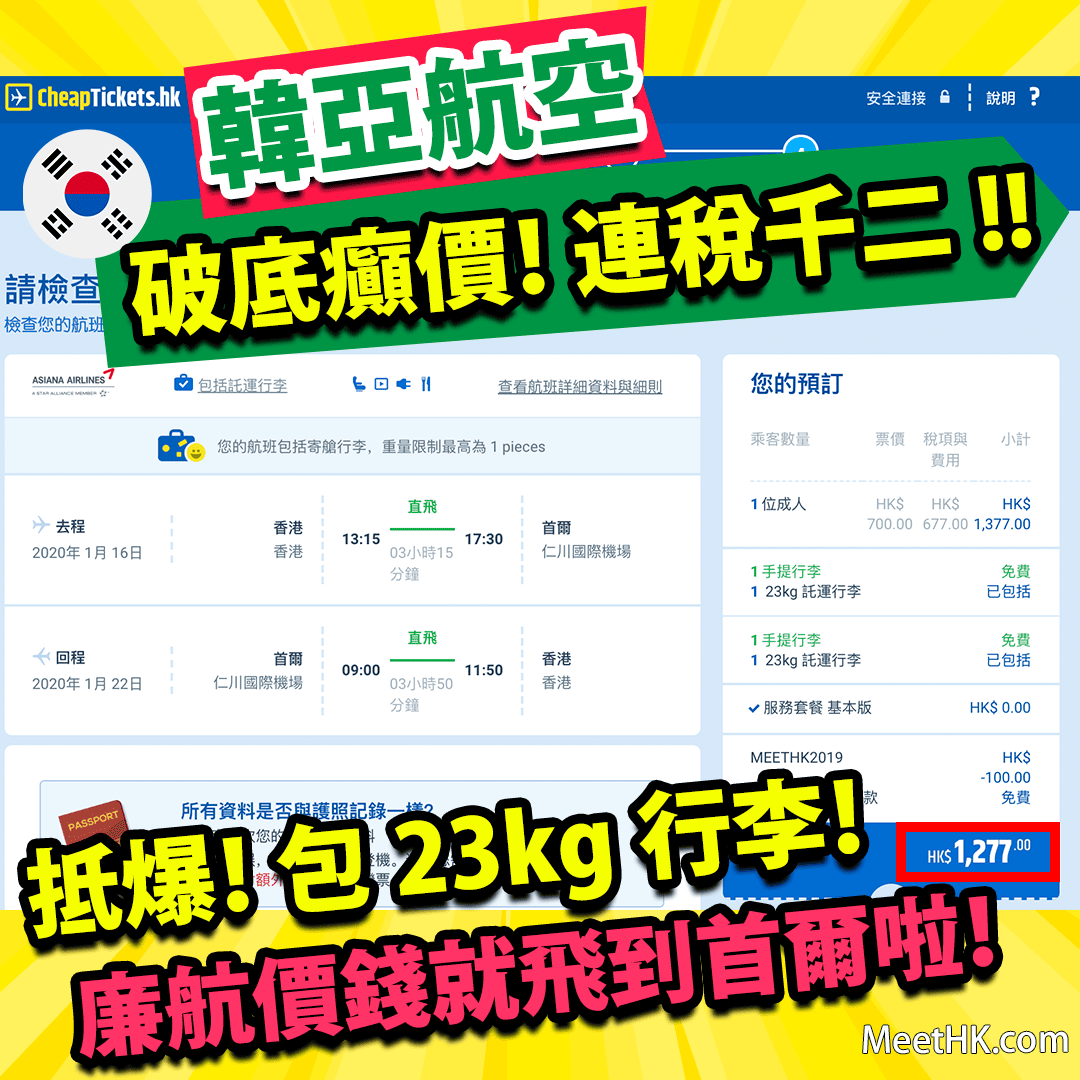 嘩嘩嘩!連稅千二咋!韓亞破底癲價飛首爾!包23kg行李!香港往返首爾只需$600起 – 韓亞航空 (優惠至1月2日)