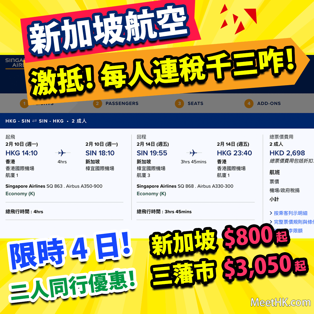 https://www.singaporeair.com/zh_TW/hk/plan-travel/local-promotions/kf-promotion/ (記得先登入KrisFlyer會員,search 2人或以上並輸入優惠代碼:KFDECHK 先可享有優惠)