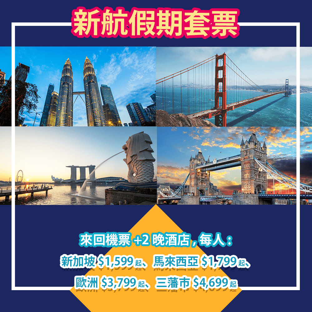 抵玩套票優惠!多個航點!仲有額外優惠!坐新加坡航空出發!來回新加坡機票連2晚酒店每人只需$1,599起、馬來西亞$1,799起、歐洲$3,799起、三藩市$4,699起 – 新航假期 (優惠至1月20日)