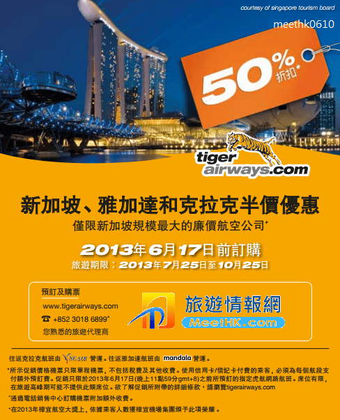 凌晨開賣!半價優惠!香港往返新加坡來回連稅只需$1,152 – 虎航 Tiger Airways (優惠至6月17日)