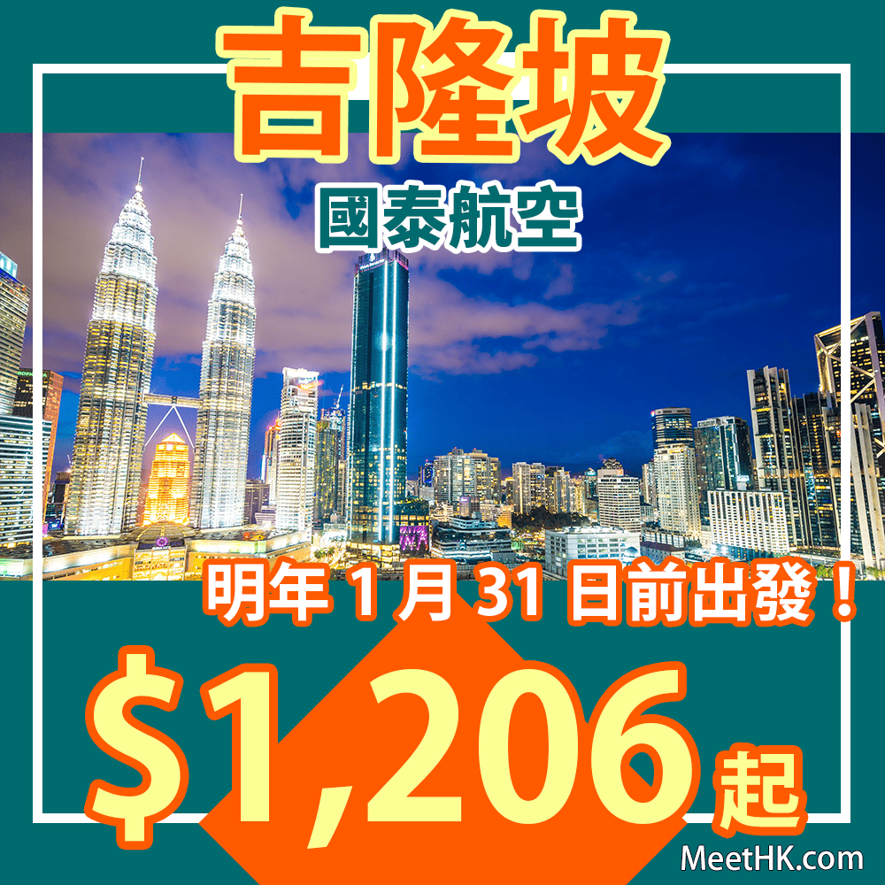 明年1月31日前出發!香港往返吉隆坡只需$1,206起 – 國泰港龍航空 (優惠至3月23日)