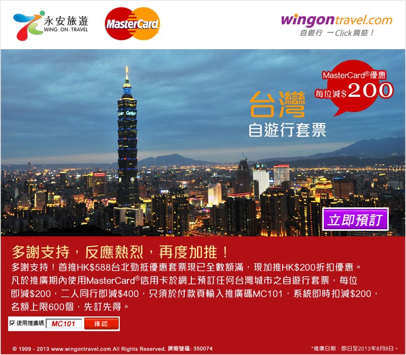 而家永安旅遊同MasterCard推出左台灣自由行套票優惠,訂購台灣任何城市自遊行套票,每位照價減$200,二人同行即係減$400