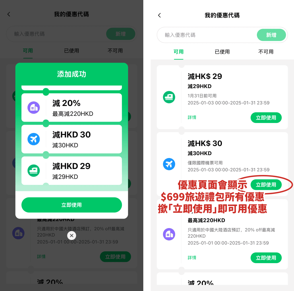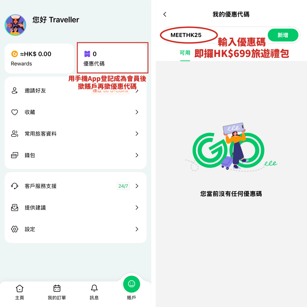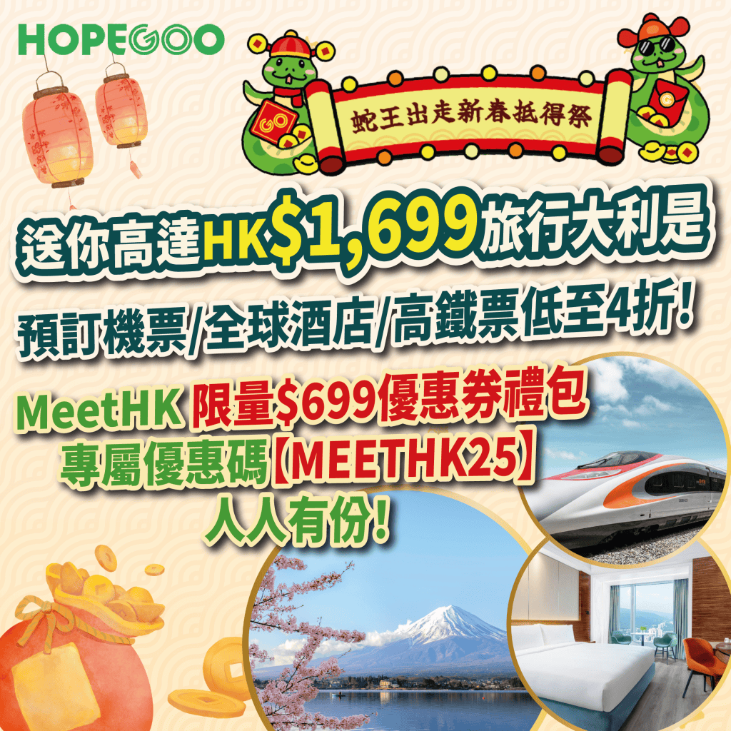 由即日起至1月31日輸入優惠碼「MEETHK25」即送你總值$699優惠券禮包!人人有份!預訂全線機票減高達$30、預訂海外/港澳/國內酒店低至8折、北上高鐵票減$29!