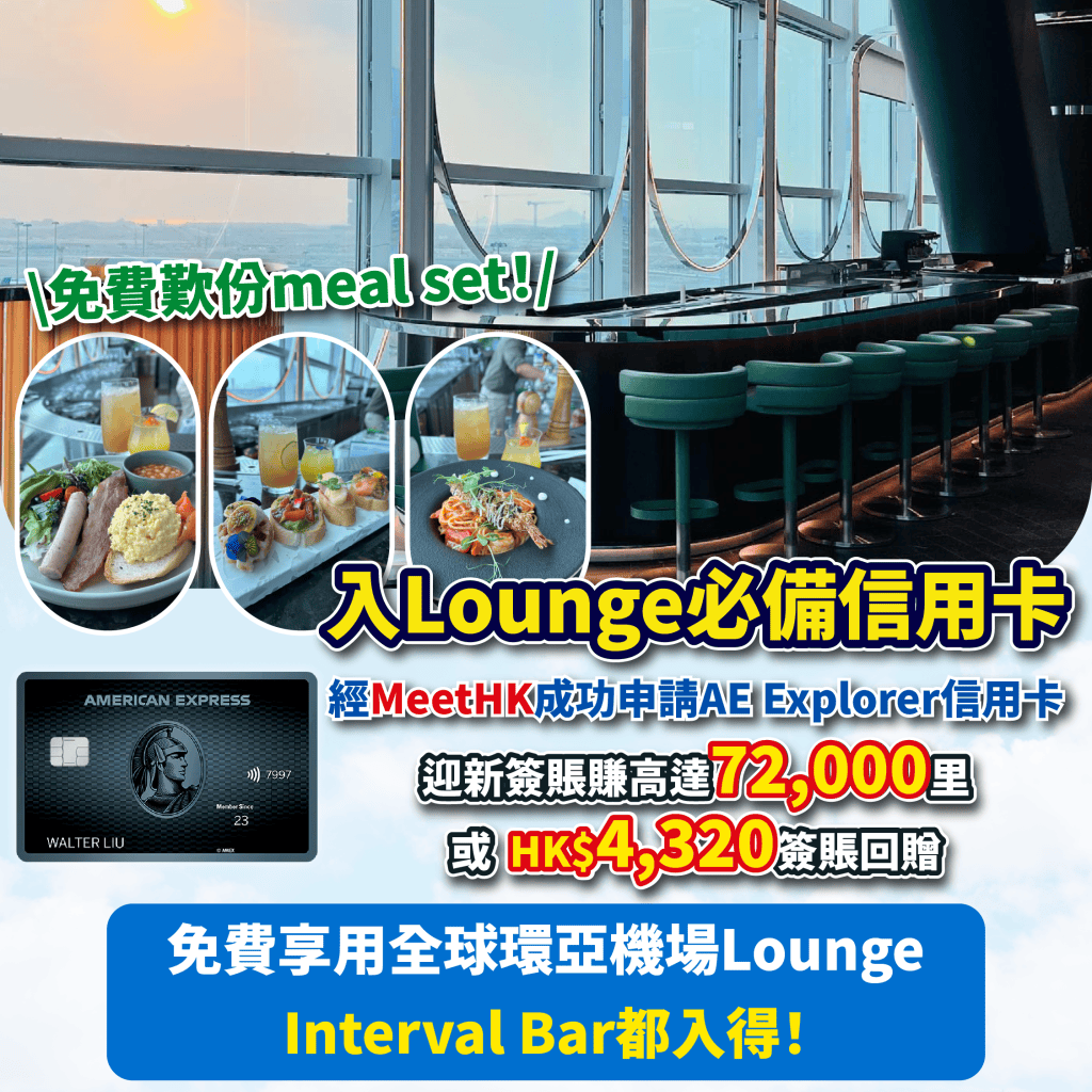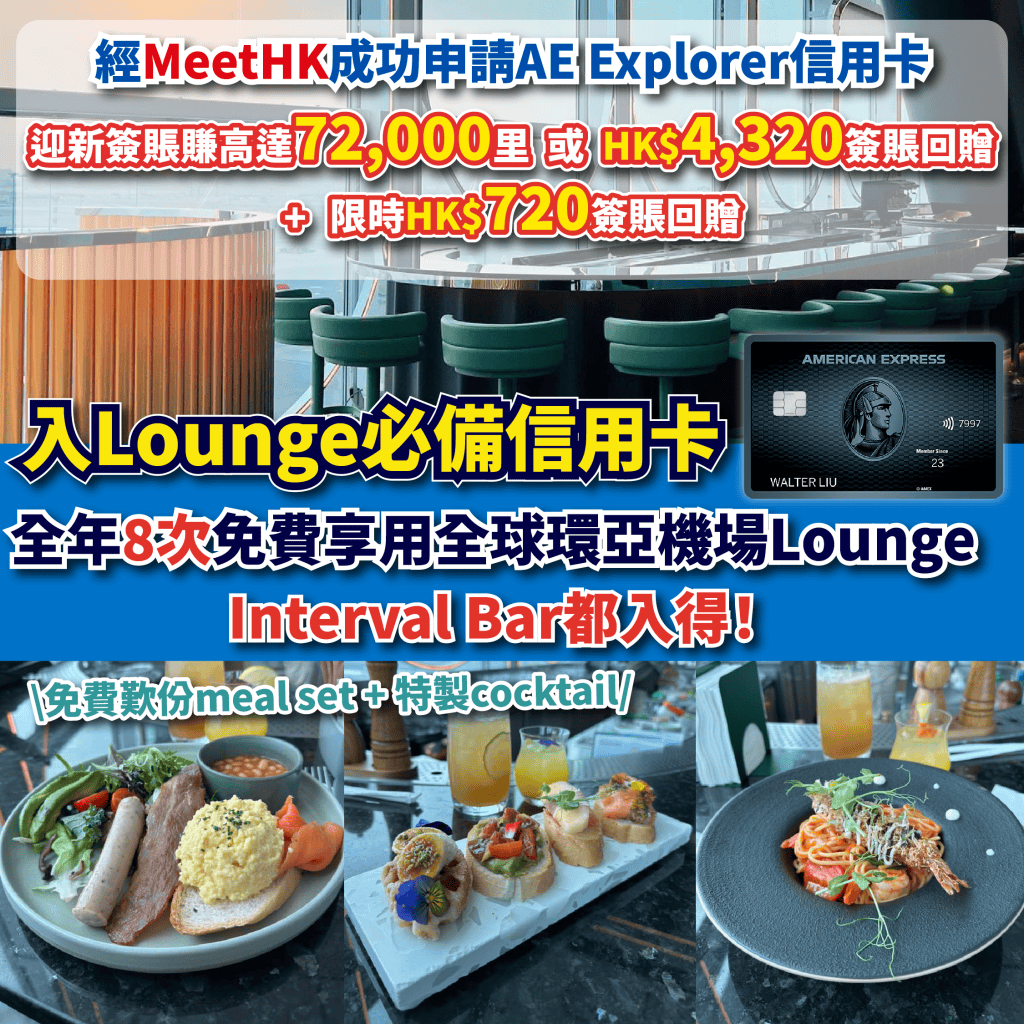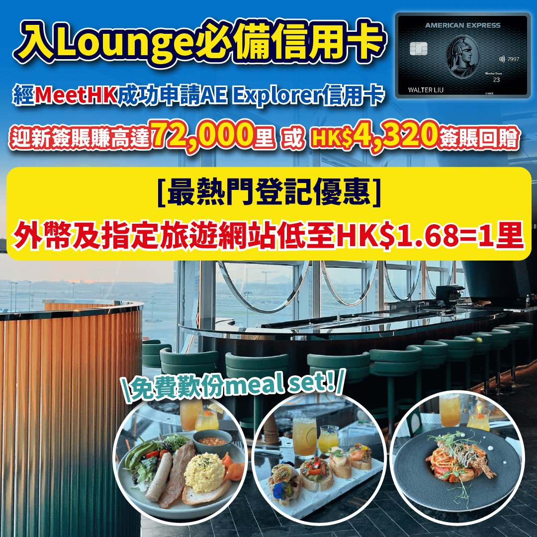 由即日至2025年8月31日,全新客戶經MeetHK指定連結( https://meethk.net/4dMam19 )申請AE Explorer信用卡,於批核後首3個月內完成首次簽賬,即可享HK$200簽賬回贈* + 18,000積分(相等於1,000里數 或 HK$60獎賞)!首3個月內累積簽滿HK$7,000更賺到126,000積分(相等於7,000里數 或 HK$420獎賞)!合共高達8,000里!