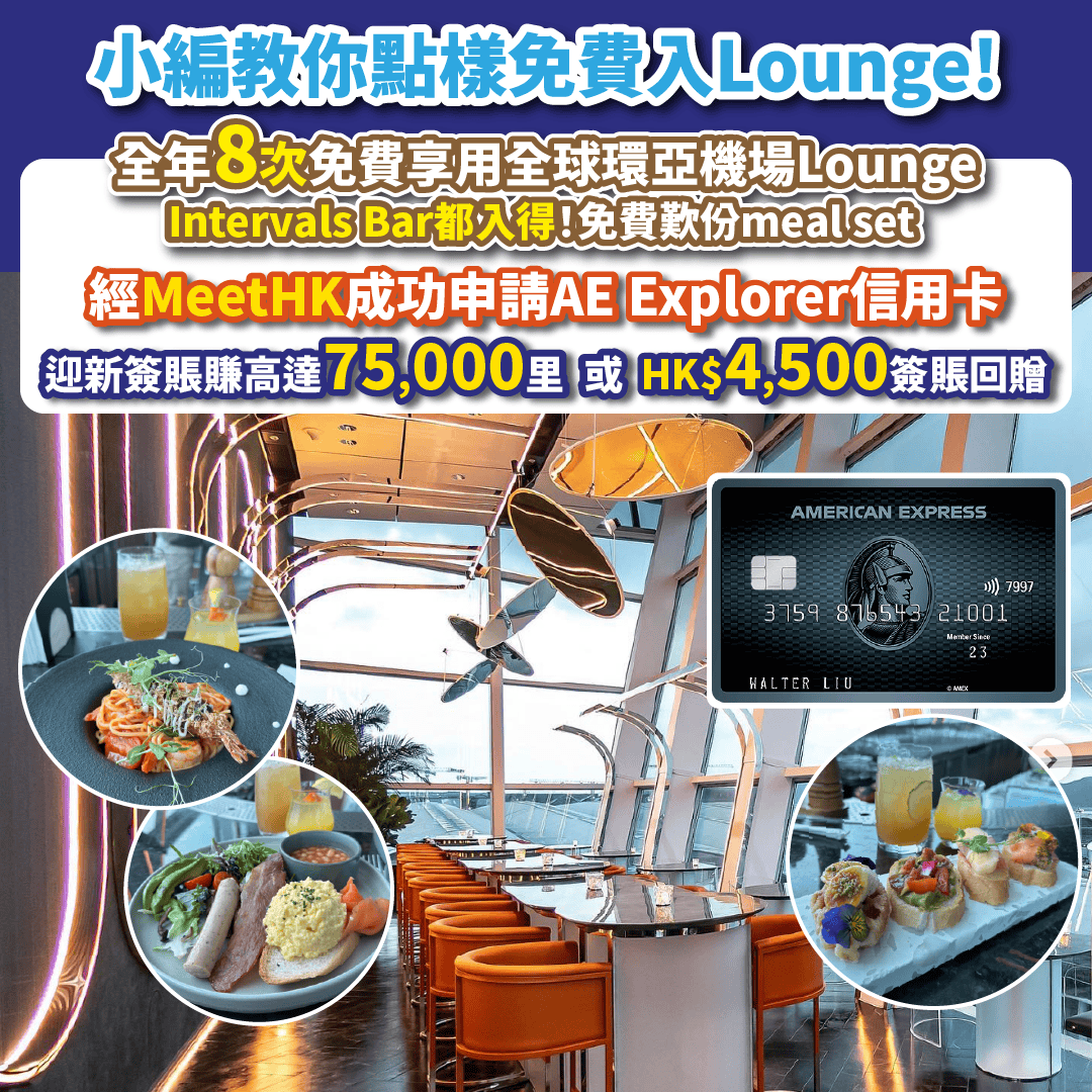 呢張入lounge必備信用卡,每年可免費使用全球環亞機場貴賓候機室高達8次,基本卡會員+附屬卡會員可以合共享用,夠晒彈性!大家除咗入環亞機場貴賓室,位於香港機場天際走廊Interval Bar都入得,未上機已經開啓旅行mood!AE Explorer 主卡最多可申請2張免費附屬卡,唔使消費都申請得!想同屋企人/另一半去旅行齊齊入lounge嘅朋友記得申請啦!