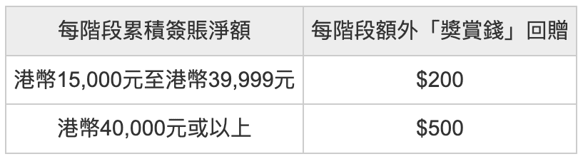 合資格本地簽賬享6X積分(HK$3 = 1里),最多賺1,152,000分(可兌換約64,000里 或 HK$3,840獎賞)