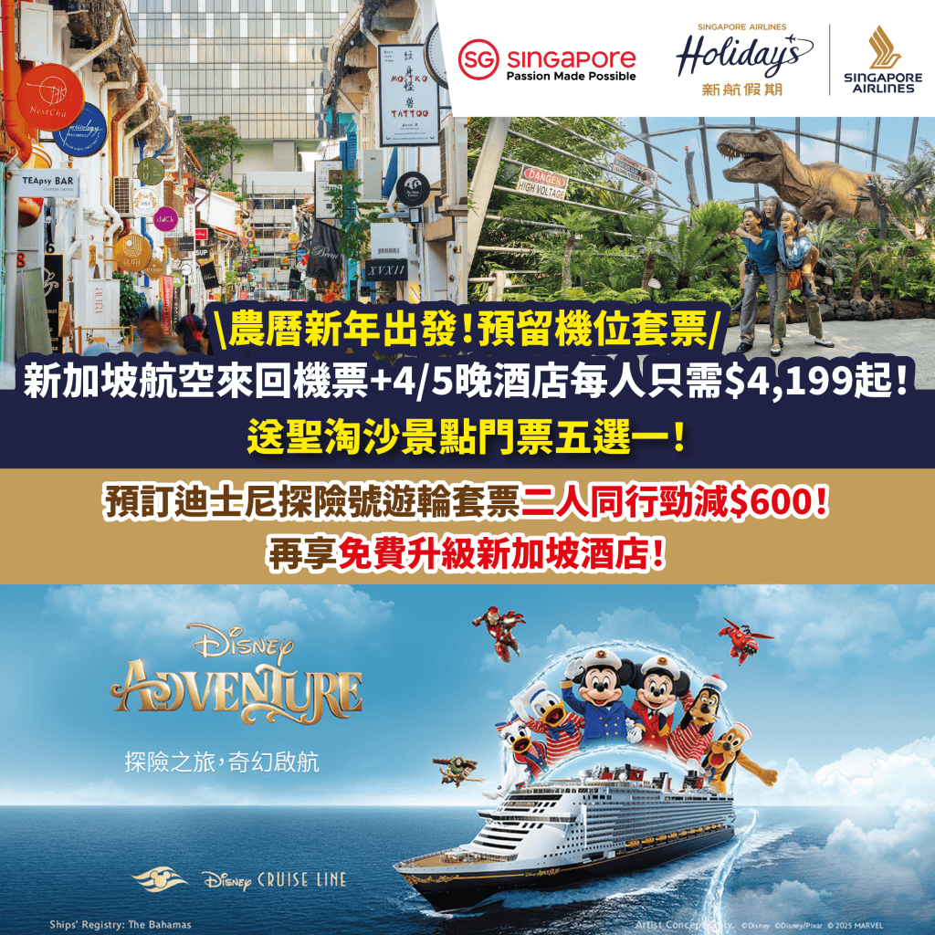 - 【旅行團及郵輪盲盒券】有機會獲得高達每位$600折扣優惠^!最少都有$320折扣優惠!