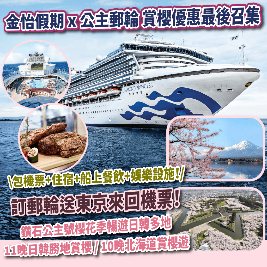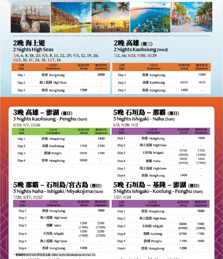 2至5晚行程,覆蓋香港出發至台灣、沖繩、宮古島等超人氣地點,仲有唔駛請假嘅週末公海遊,快閃旅行so easy!