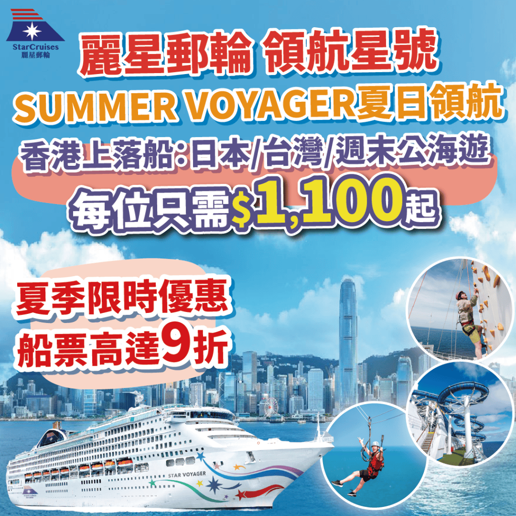 【麗星郵輪Summer Voyager夏日領航】夏季船票高達9折優惠!一家大細出發!「領航星號」香港上落船:日本、台灣、週末公海遊每位只需$1,100起!包早午晚三餐+探索樂園+水上滑梯+兒童跳舞/烹飪/唱歌活動!