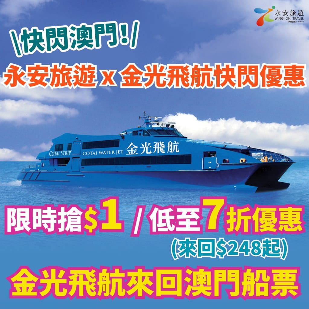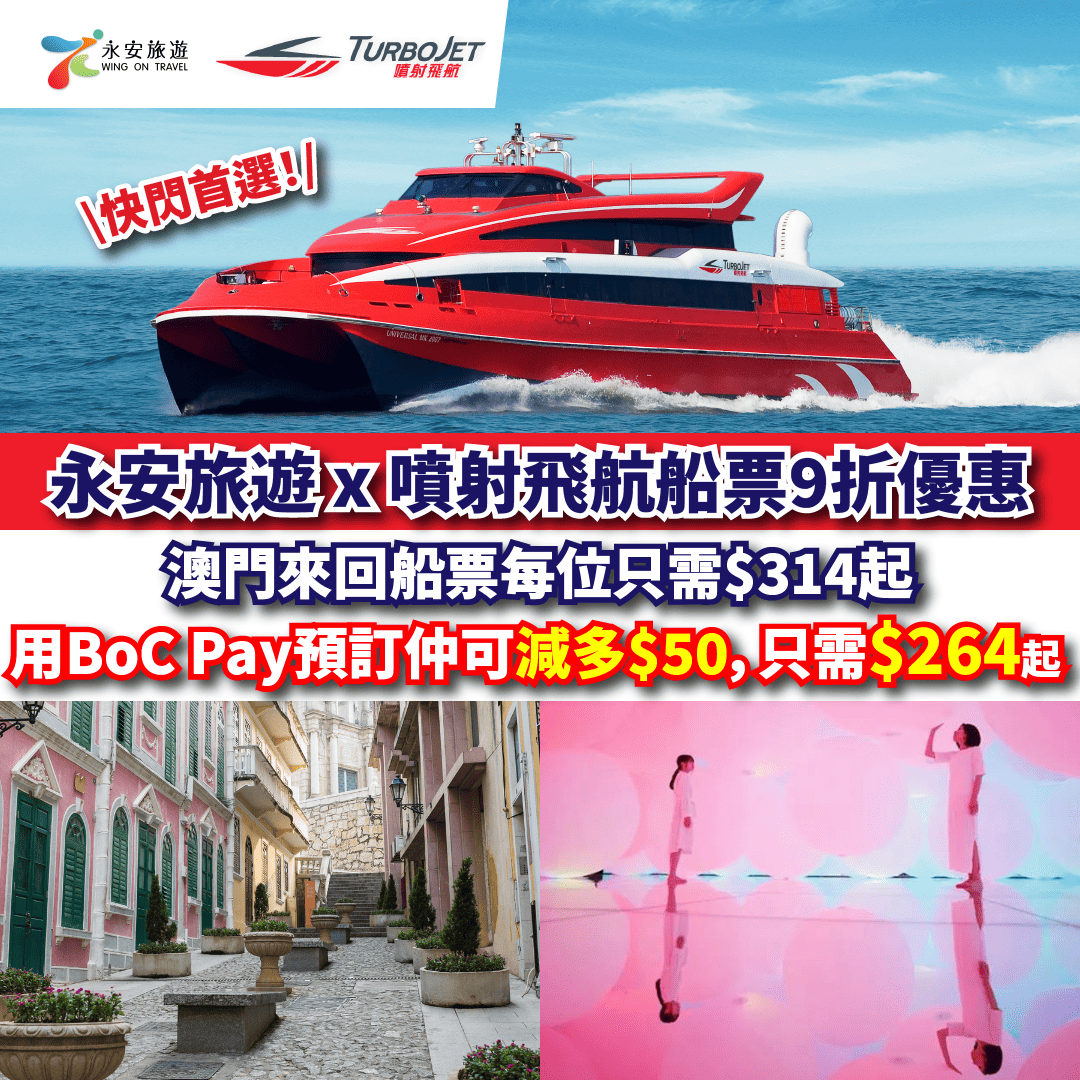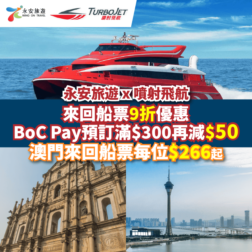 【永安旅遊 x 噴射飛航船票9折優惠】快閃澳門!BoC Pay預訂仲可享滿$300減$50優惠!澳門來回船票每位只需$266起!