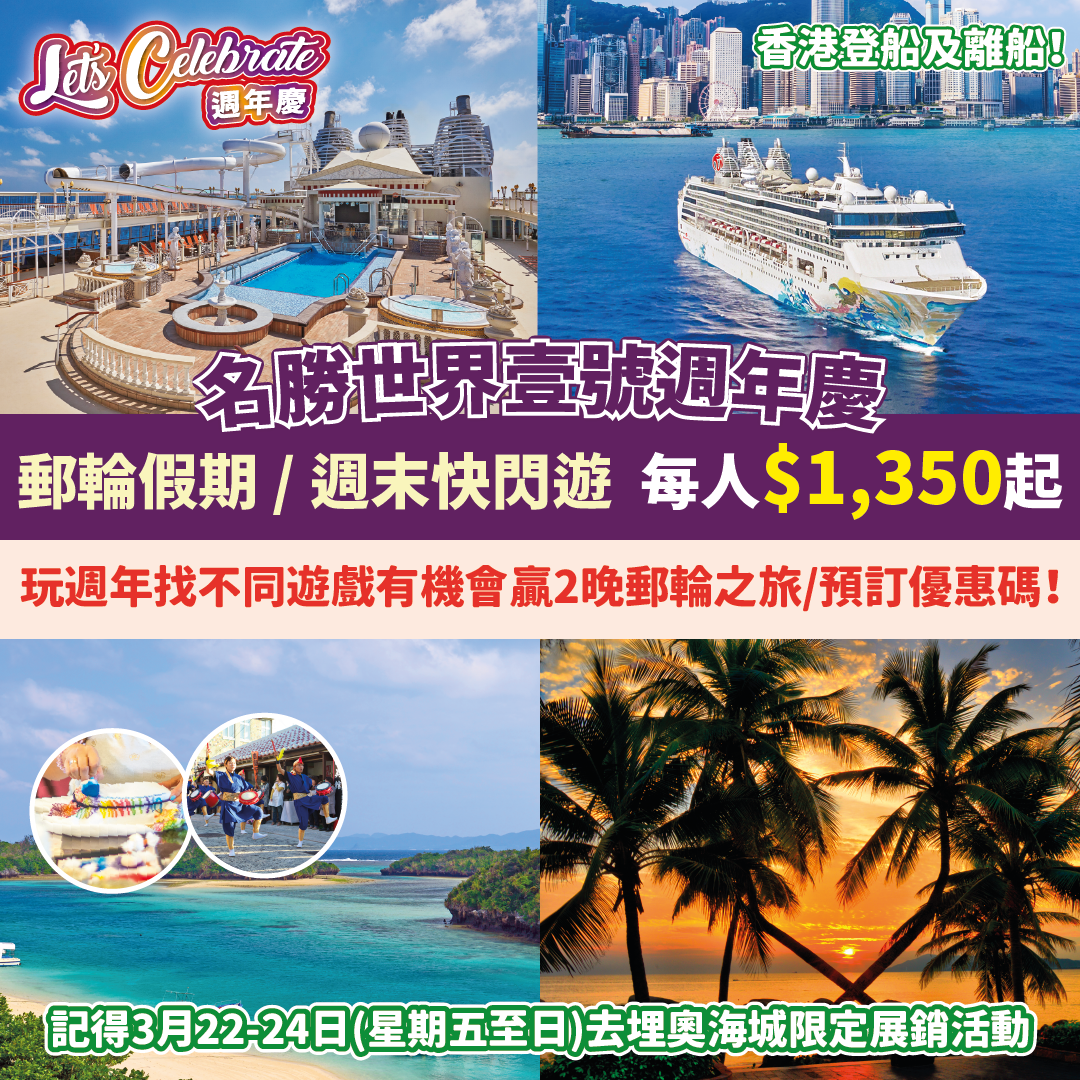 【名勝世界壹號1週年啦】Let’s Celebrate!玩遊戲贏2晚郵輪之旅/預訂優惠碼!記得22-24/3去埋奧海城限定展銷活動!週年慶優惠:指定航次船費9折,2/3晚郵輪假期每人只需$1,350起!