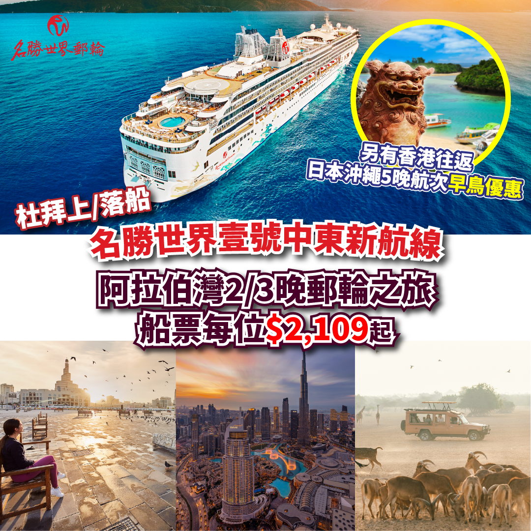 名勝世界壹號係目前唯一以香港為母港嘅郵輪!船上有多元化嘅設施+親子活動+多國美食!新春期間仲會有一系列特別賀年活動同你過新年!好似舞龍、寫福字、多個新年工藝品工作坊等!依家預訂2月出發指定航線第1/2位乘客可享低至半價優惠!香港、沖繩(那霸、宮古島)6天郵輪船票,2人同行平均每人只需$3,650起!立即預訂:https://bit.ly/3OCABMb