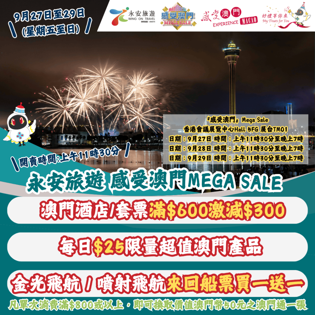 【永安旅遊 – 『感受澳門』Mega Sale 】<香港秋季旅遊博覽會> 會場限定優惠!澳門酒店/套票滿$600激減$300!每日$25限量超值澳門產品!來回船票買一送一!