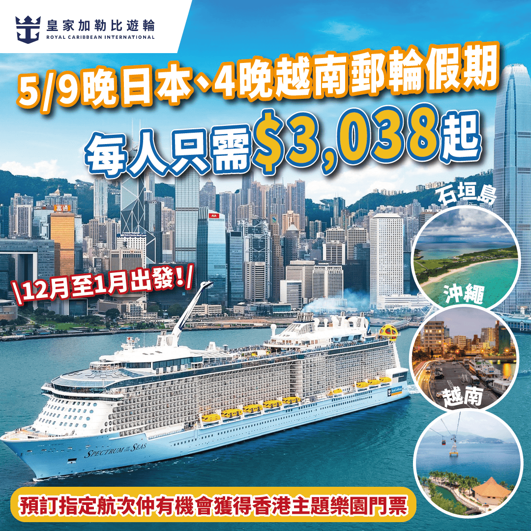 【皇家加勒比遊輪 – 海洋光譜號】終於回歸!12月至1月出發!5/9晚日本(沖繩那霸、石垣島 / 鹿兒島、宮崎、長崎、福岡)、4晚越南(芽莊)郵輪假期每人只需$3,038起!香港上/落船!包住宿+船上餐飲+娛樂設施!