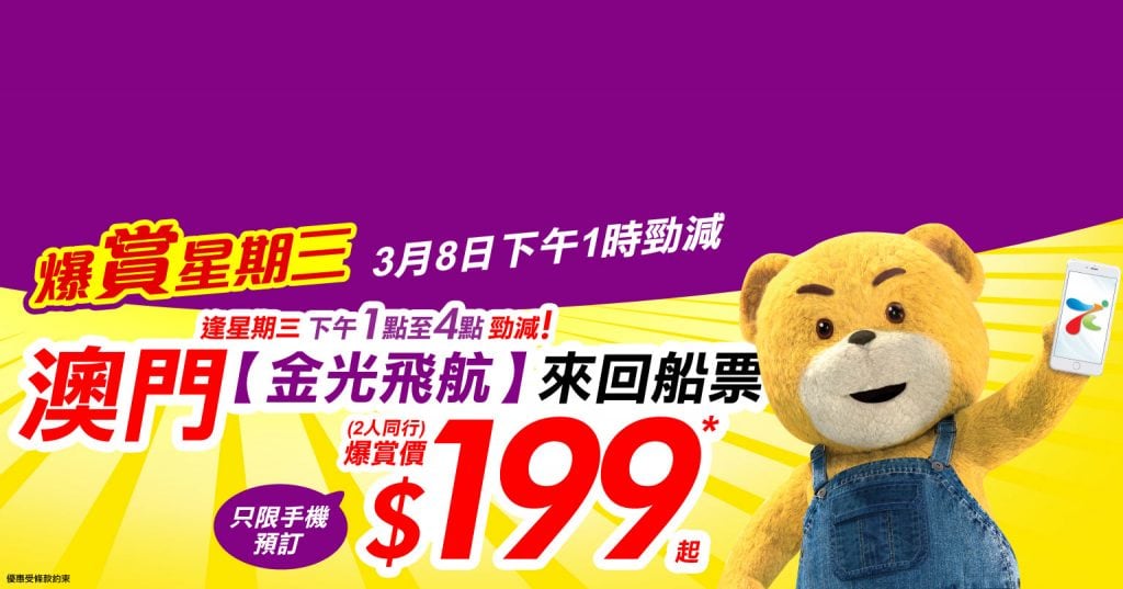 爆爆爆抵!限搶3小時!來回澳門船飛$209!金光飛航香港至澳門來回船票每人只需$209,再送百老匯精選美食券(價值MOP70)+英記餅家現金券(價值MOP30) – 永安旅遊 (優惠至8月29日4pm)