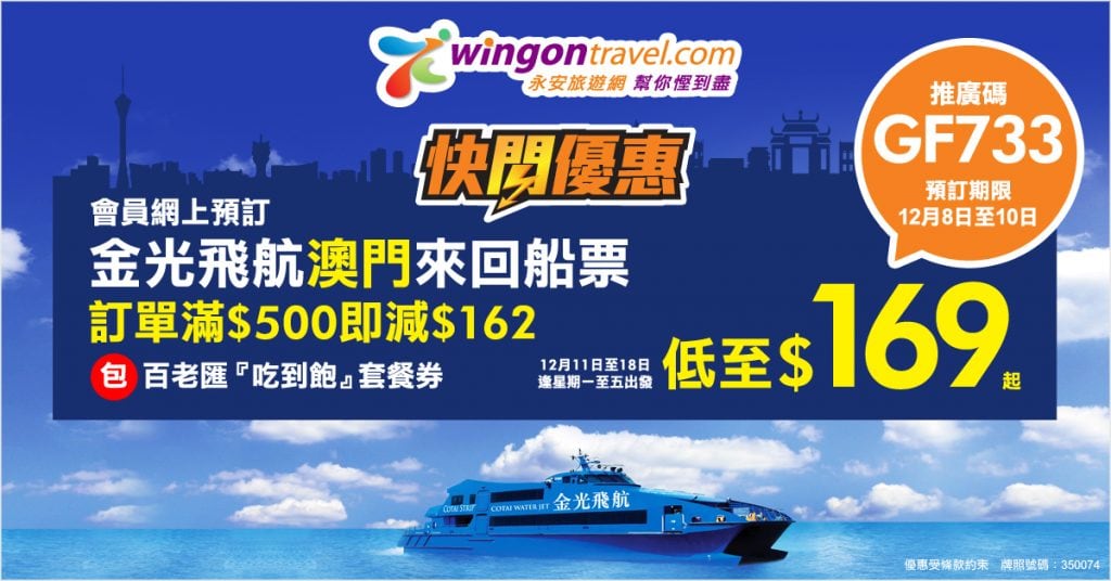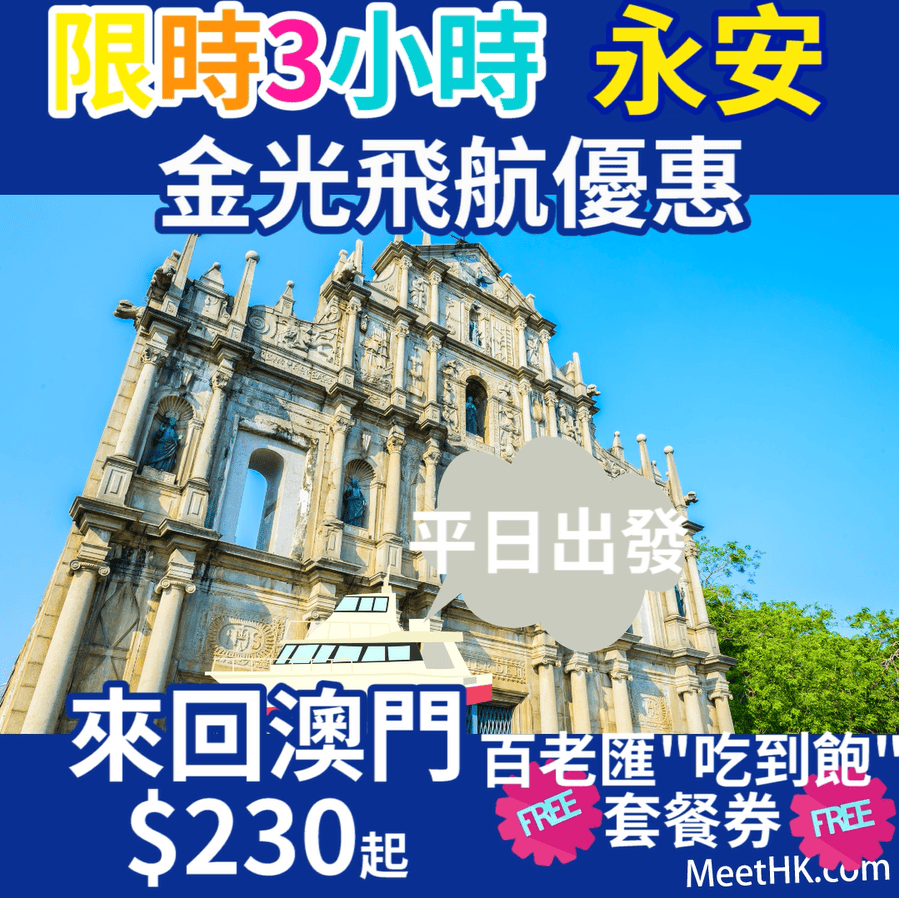 冇睇錯!永安旅遊推出超抵優惠!金光飛航來回澳門船飛只係$209!仲送總值MOP100美食券!
