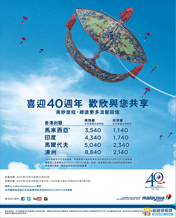 馬來西亞航空係1972年10月1日正式營運,今個月係馬航40週年紀念,佢地係今日推出左一系列既機票優惠慶祝呢個大日子