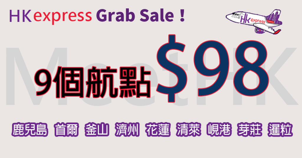 買回程,去程$1!今晚12點開賣!香港飛台灣/東南亞來回$249起,日本各地$329起,首爾/釜山/濟州$369起 – HK Express (優惠至8月31日)