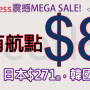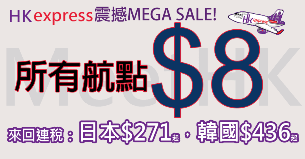 嘩嘩嘩!跳樓價!全線八蚊雞Mega Sale!迫你飛飛飛!今晚12點必搶!所有航點單程只需$8 – HK Express (優惠至5月1日)