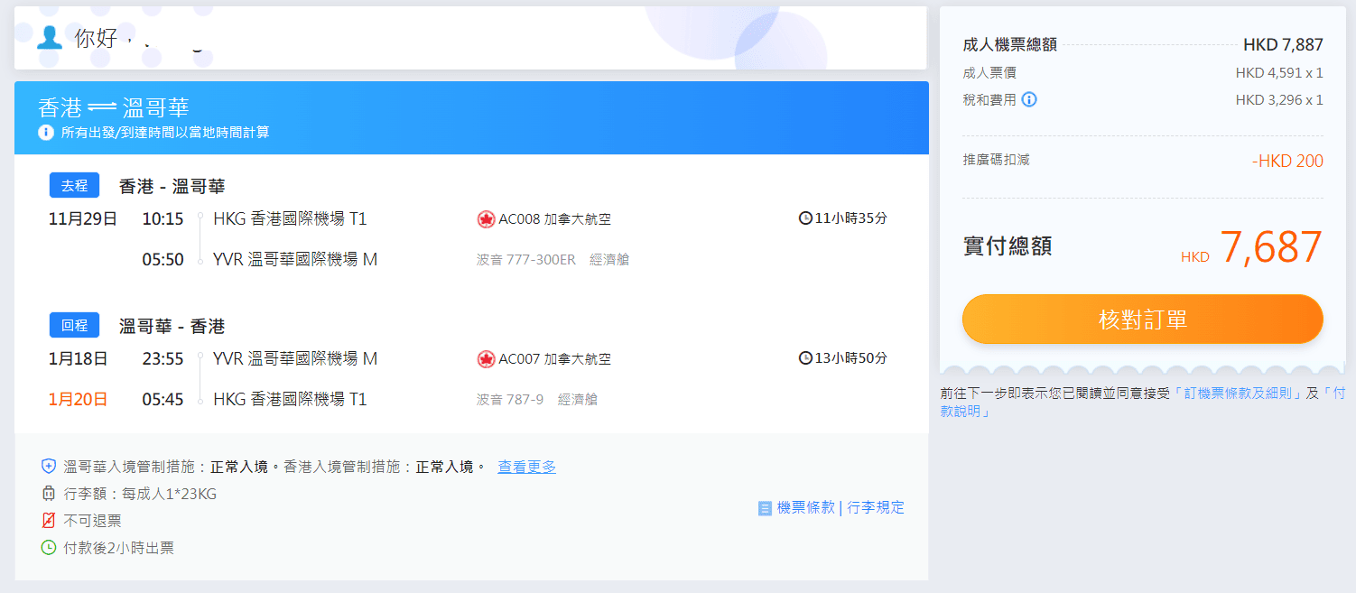 減$300後,香港飛洛杉磯來回連稅只需$4,511起,包23kg行李