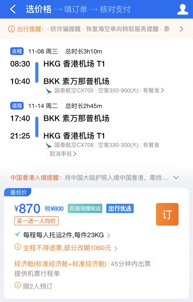暫時所見以下日子都有平飛 (僅供參考)