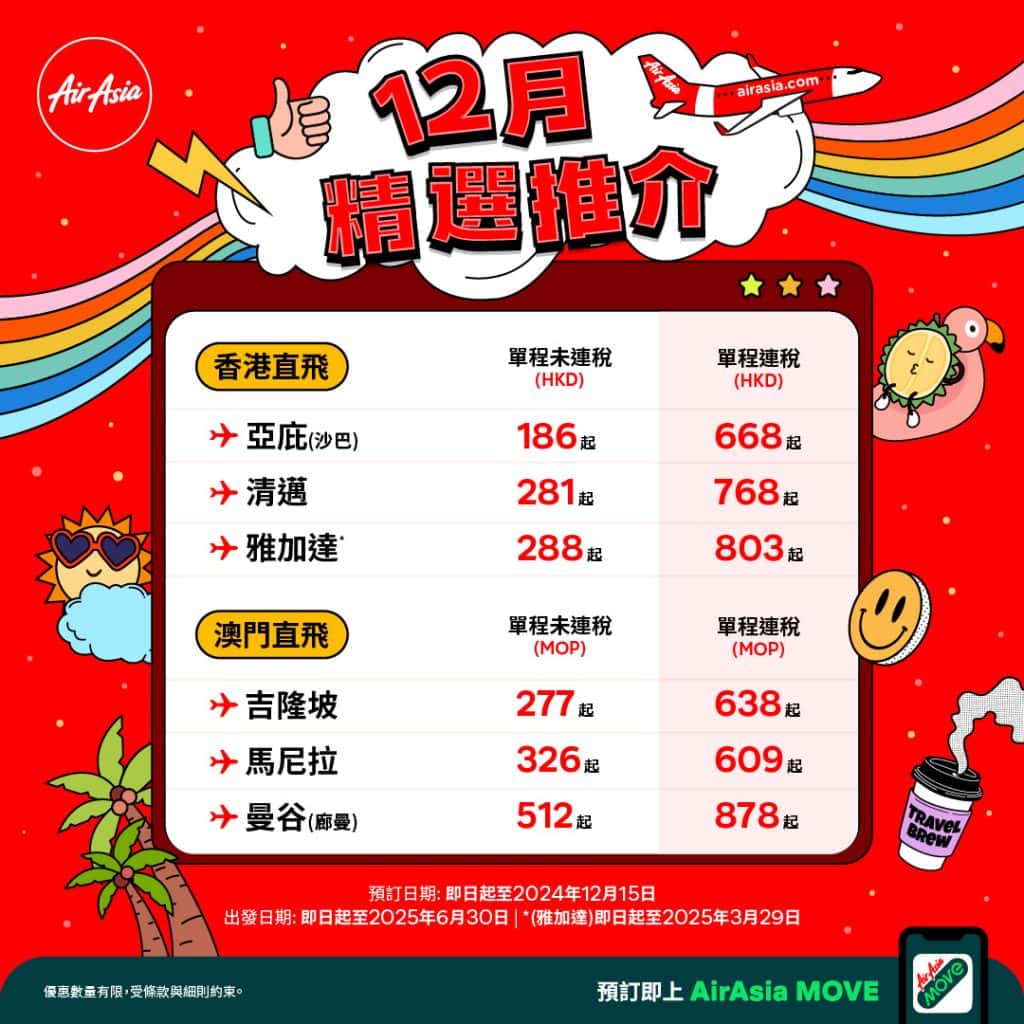 **票價視乎機位供應情況及匯率而定,有些航點可能有不適用期和航班限制。其他條款及細則適用。