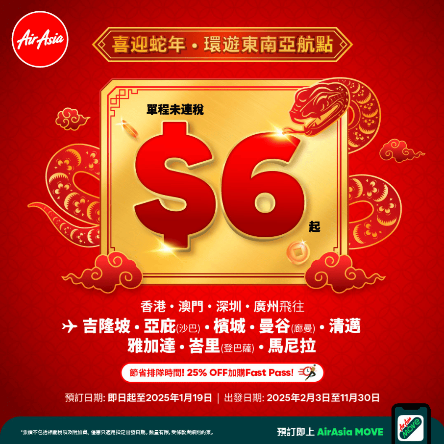 - 於2025年3月10日前以優惠碼「KFTTFHK」免費註冊成為KrisFlyer會員,可享800迎新哩程
