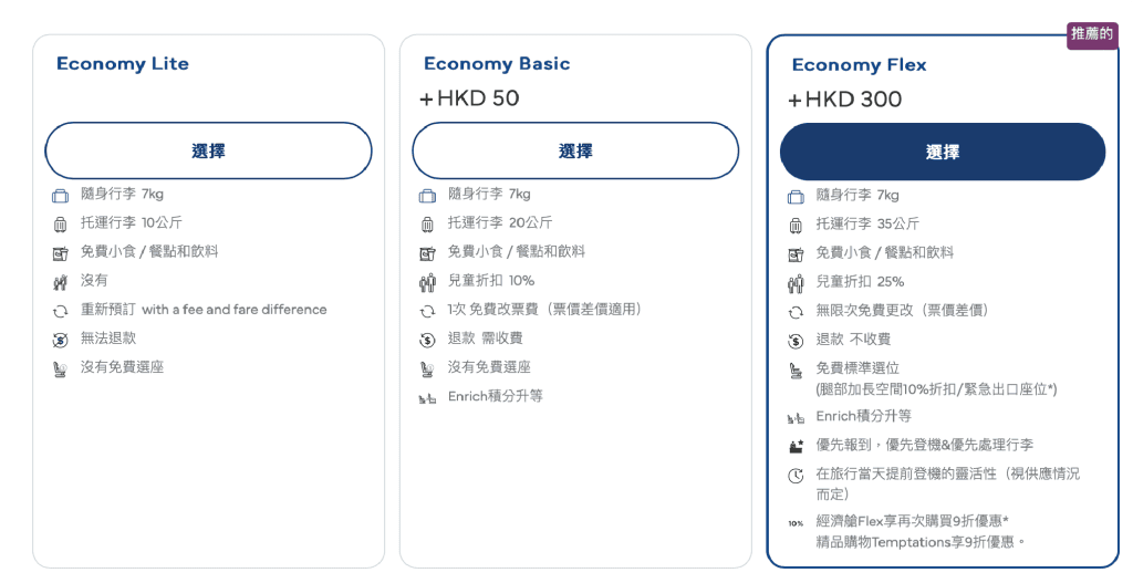 想再多啲?每程加$300起升級”Economy Flex”,咁就最多有35kg寄艙行李,仲可以享優先登機服務 /優先處理寄艙行李,兼有無限次免費更改+退票免手續費!