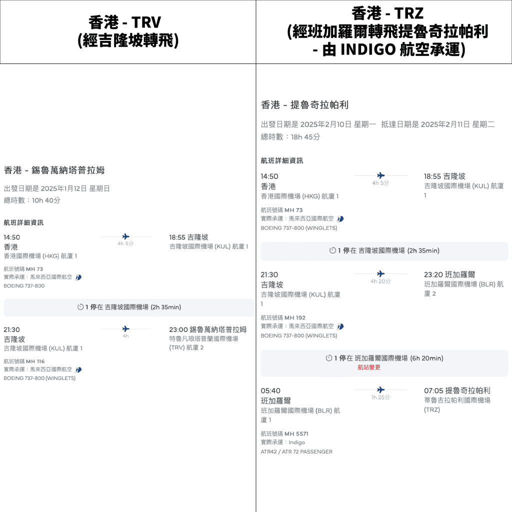 回程 (特里凡得琅直飛吉隆坡):MH117 00:01-06:45(一、五)、MH205 01:20-08:05(日、三)