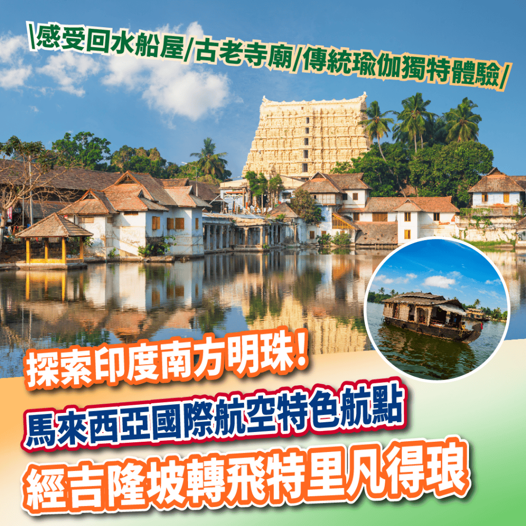探索印度南方明珠!感受回水船屋/古老寺廟/傳統瑜伽獨特體驗!馬來西亞國際航空特色航點!香港飛特里凡得琅來回連稅$4,613起
