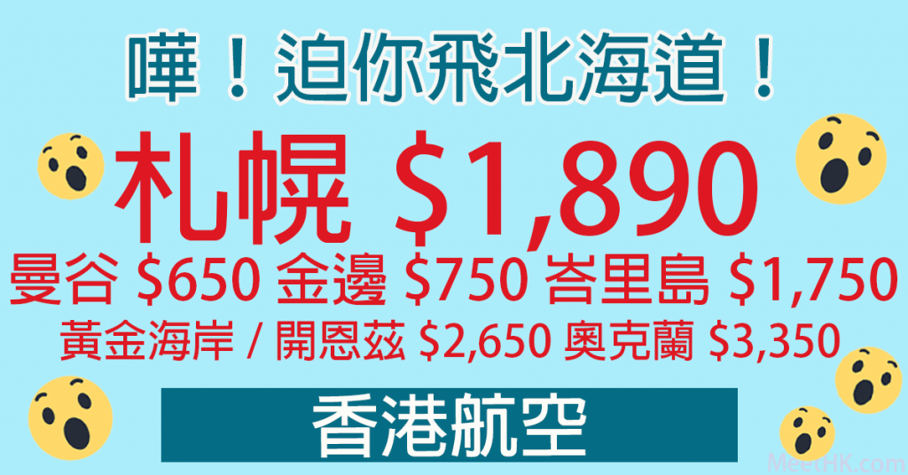 嘩!$1,890迫你飛北海道!香港往返札幌只需$1,890,曼谷$650,金邊$750,峇里島$1,750,黃金海岸/開恩茲$2,650,奧克蘭$3,350 – 香港航空 (優惠至2月22日)