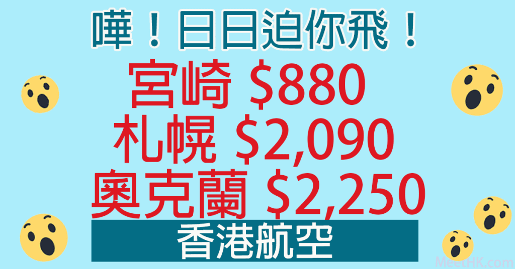 嘩!日日迫你飛!香港往返宮崎只需$880,札幌$2,090,奧克蘭$2,250;Business Class飛首爾$2,950 – 香港航空 (優惠至3月22日)