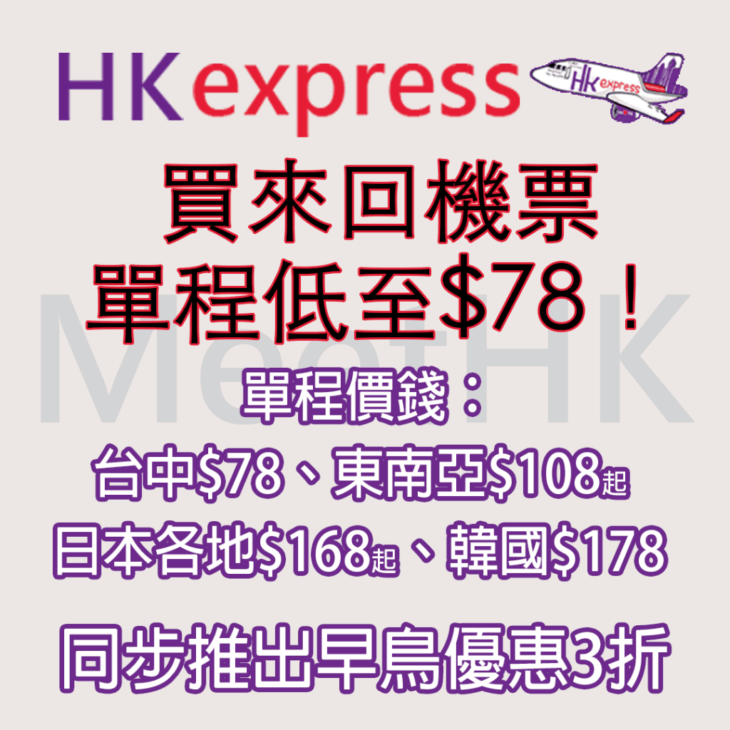 單程低至$78!早鳥優惠低至3折!全線航點開賣!雙重優惠同步推出!香港飛台中單程只需$78、東南亞$108起、日本各地$168起、韓國$178 – HK Express (優惠至11月10日)