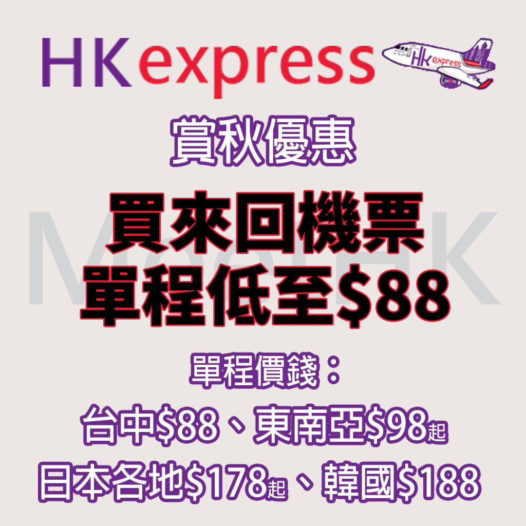 單程低至$88!賞秋優惠!全線航點開賣!香港飛台中單程只需$88、東南亞$98起、日本各地$178起、韓國$188 – HK Express (優惠至9月22日)