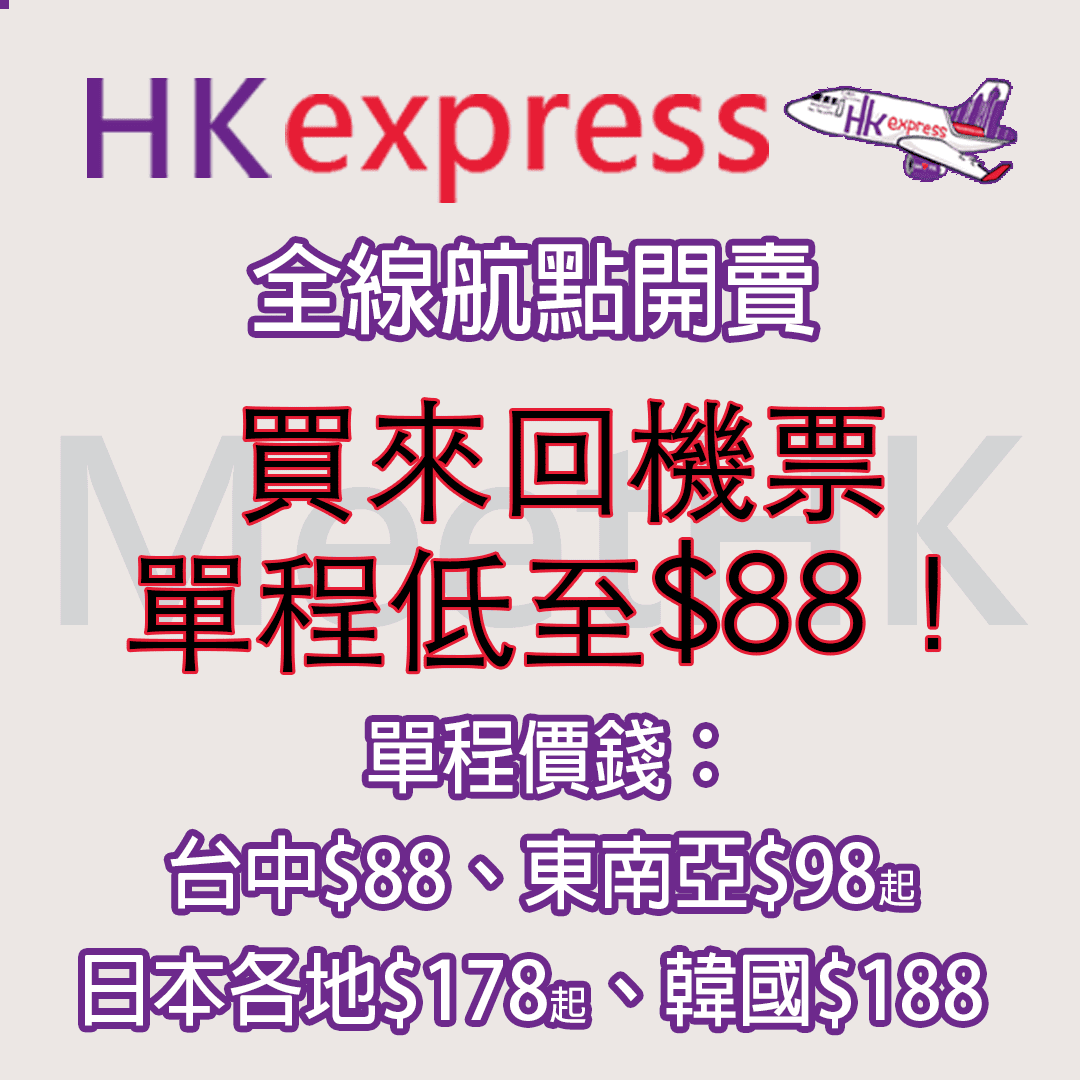 單程低至$88!初秋優惠!全線航點開賣!香港飛台中單程只需$88、東南亞$98起、日本各地$178起、韓國$188 – HK Express (優惠至9月15日)
