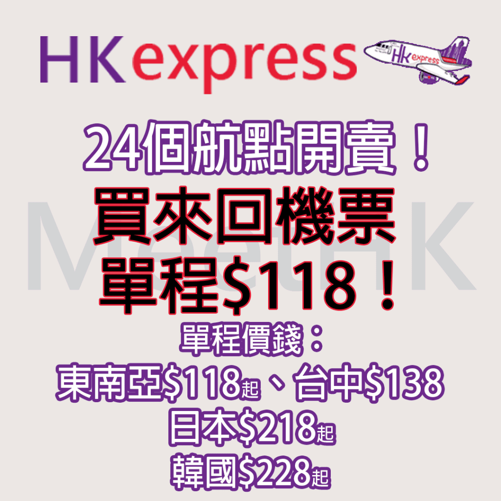 買來回機票單程低至$118!HK Express會係朝早9點推出優惠!24個航點開賣!