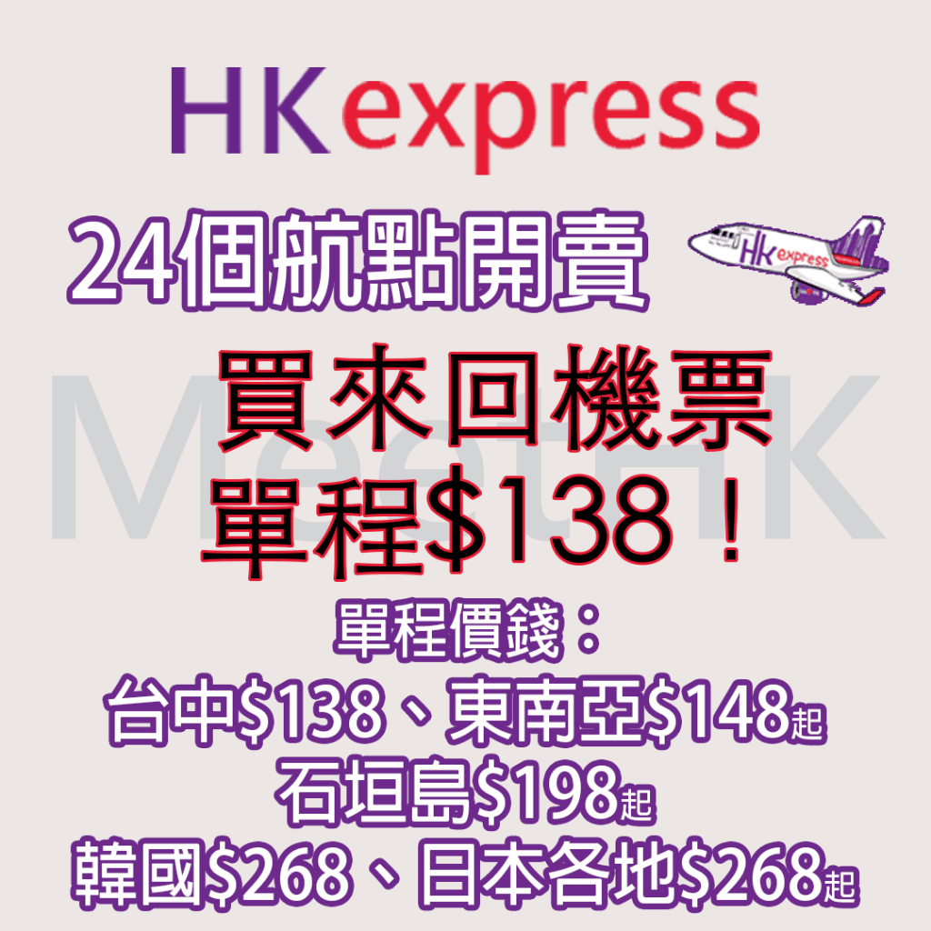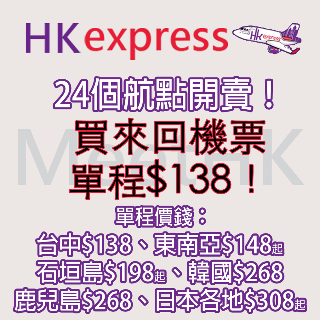 買來回機票單程低至$138!24個航點開賣!香港飛台中單程只需$138、東南亞$148起、石垣島$198、韓國/鹿兒島$268、日本各地$308起 – HK Express (優惠至4月18日)